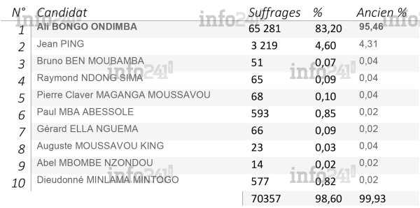 Autre chamboulement dans la hiérarchie générale, Abel Mbombe Nzondou (9e avec 0,12%) quitte la dernière place pour terminer avant-dernier du scrutin au détriment de Dieudonné Minlama Mintogo (10e avec 0,11%). Le 3e homme demeure Bruno Ben Moubamba (avec 0,59%) qui gagne en nombre d’électeurs, suivi respectivement de Raymond Ndong Sima (4e avec 0,42%), Pierre Claver Maganga Moussavou 5e avec 0,34%), Paul Mba Abessole (6e avec 0,23%), Gérard Ella Nguema (7e avec 0,15%) et Auguste Moussavou King (8e avec 0,13%).