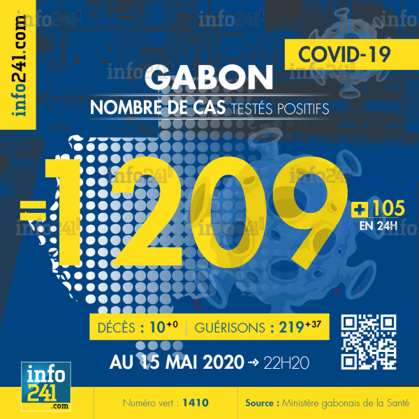 Le bilan de l’épidémie de coronavirus au Gabon au 15 mai : 105 nouveaux cas enregistrés en 24h à Franceville (1 nouveau cas), Mvengué (3 nouveaux cas), Moanda (2 nouveaux cas), Mounana (1 nouveau cas), Libreville (103 nouveaux cas) et à Lambaréné (1 nouveau cas). Il n’y a eu aucun nouveau décès et 37 nouvelles guérisons. Ce qui porte le bilan à 1209 cas confirmés, 10 décès et 219 guérisons. Il y a 125 personnes hospitalisées dont 11 en réanimation.