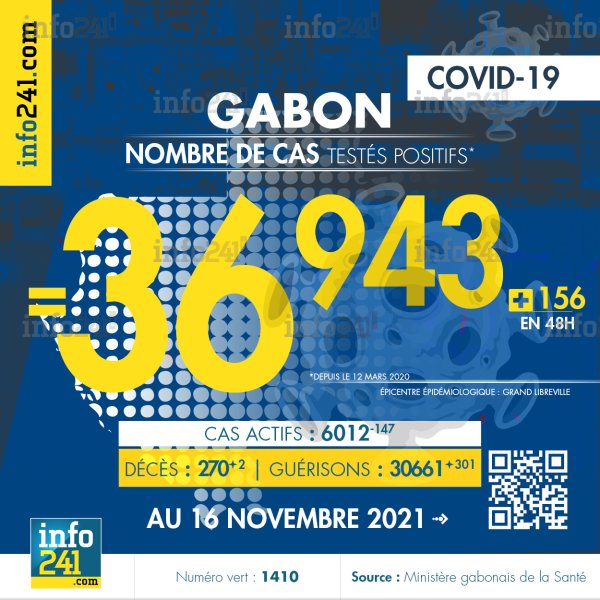 Bilan épidémiologique du Gabon au 16 novembre 2021 : 156 nouveaux cas enregistrés en 48h dans l’Estuaire (91 cas), l’Ogooué-Maritime (35 cas), l’Ogooué-Ivindo (13 cas), le Haut-Ogooué (7 cas), la Nyanga (5 cas), le Moyen-Ogooué (4 cas) et la Ngounié (1 cas). Il y a eu 2 nouveaux décès et 301 nouvelles guérisons.