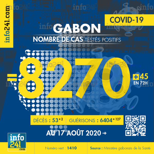 Ce qui porte le bilan à 8 270 cas confirmés, 53 décès et 6 404 guérisons.Le Gabon compte actuellement 2 106 cas actifs de la pandémie officiellement déclarés. Parmi eux 30(+1) patients hospitalisés dans le pays dont 2(+1) en réanimation.