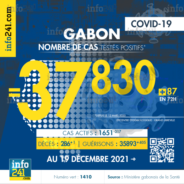 Bilan épidémiologique du Gabon au 19 décembre 2021 : 87 nouveaux cas enregistrés en 72h dans l’Estuaire (80 cas), l’Ogooué-Maritime (4 cas), l’Ogooué-Lolo (2 cas) et le Woleu-Ntem (1 cas). Il y a eu un nouveau décès et 405 nouvelles guérisons.