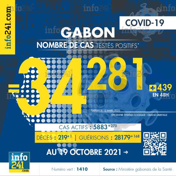 Ce qui porte le bilan à 34 281 cas confirmés, 219 décès et 28 179 guérisons. Le Gabon compte actuellement 5 883 (+270) cas actifs de la pandémie officiellement déclarés. Parmi eux 101 (-16) patients hospitalisés dans le pays dont 22 (-5) en réanimation.