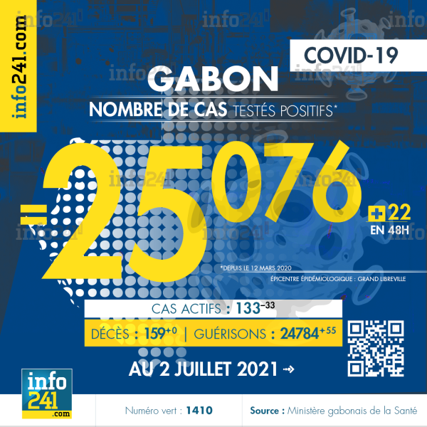 Ce qui porte le bilan à 25 076 cas confirmés, 159 décès et 24 784 guérisons. Le Gabon compte actuellement 133(-33) cas actifs de la pandémie officiellement déclarés. Parmi eux 19 patients hospitalisés dans le pays dont 11 en réanimation.