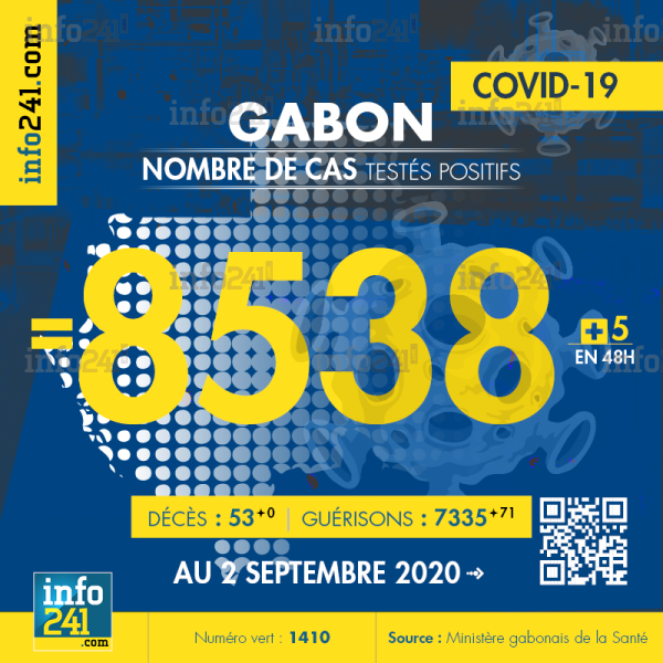 Ce qui porte le bilan à 8 538 cas confirmés, 53 décès et 7 335 guérisons. Le Gabon compte actuellement 1 150 cas actifs de la pandémie officiellement déclarés. Parmi eux 30(+0) patients hospitalisés dans le pays dont 2(+0) en réanimation.