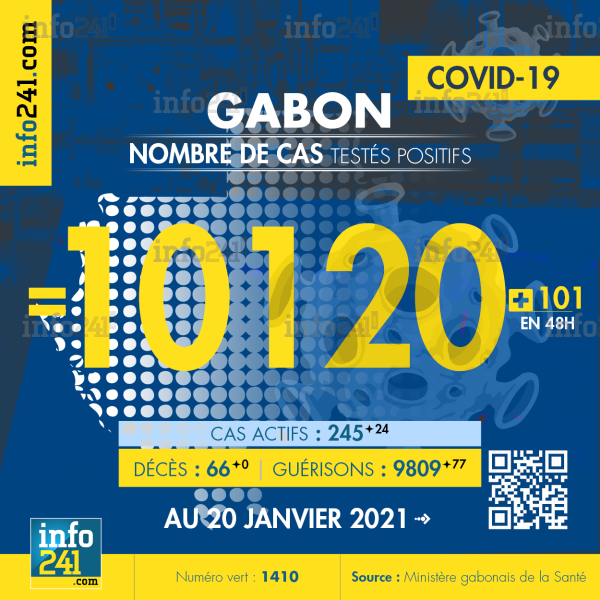 Ce qui porte le bilan à 10 120 cas confirmés, 66 décès et 9 809 guérisons. Le Gabon compte actuellement 245(+24) cas actifs de la pandémie officiellement déclarés. Parmi eux 24(+7) patients hospitalisés dans le pays dont 11(+0) en réanimation.