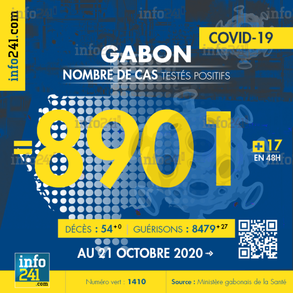 Ce qui porte le bilan à 8 901 cas confirmés, 54 décès et 8 479 guérisons. Le Gabon compte actuellement 368(-29) cas actifs de la pandémie officiellement déclarés. Parmi eux 6(+0) patients hospitalisés dans le pays dont 2(-0) en réanimation.