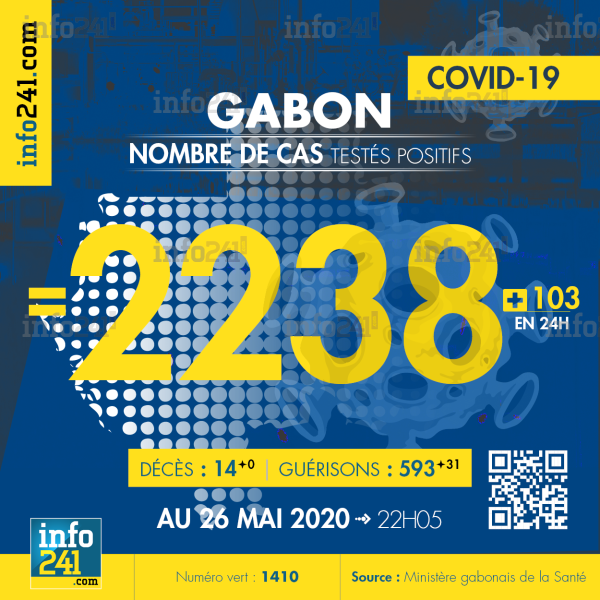Le bilan de l’épidémie de coronavirus au Gabon au 26 mai : 103 nouveaux cas enregistrés en 24h dans l’Estuaire, le Haut-Ogooué, le Moyen-Ogooué et le Woleu-Ntem, Il n’y a eu aucun nouveau décès et 31 nouvelles guérisons. Ce qui porte le bilan à 2 238 cas confirmés, 14 décès et 593 guérisons. Il y a actuellement 123 patients hospitalisés dans le pays dont 11 en réanimation.