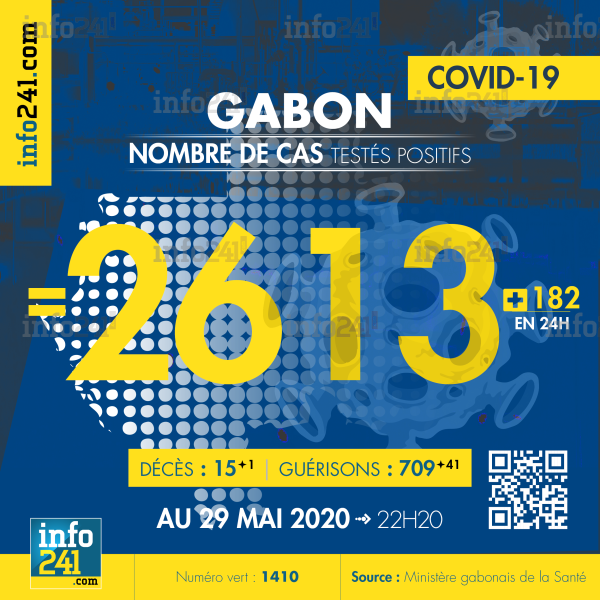 Le bilan de l’épidémie de coronavirus au Gabon au 29 mai : 182 nouveaux cas enregistrés en 24h dans l’Estuaire (161 cas), Haut-Ogooué (19 cas) et le Moyen-Ogooué (2 cas). Il y a eu un nouveau décès et 41 nouvelles guérisons. Ce qui porte le bilan à 2 613 cas confirmés, 15 décès et 709 guérisons. Il y a actuellement 80 patients hospitalisés dans le pays dont 15 en réanimation.