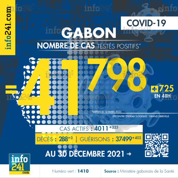 Bilan épidémiologique du Gabon au 30 décembre 2021 : 725 nouveaux cas enregistrés en 48h dans l’Estuaire (579 cas), l’Ogooué-Maritime (73 cas), le Haut-Ogooué (33 cas), le Moyen-Ogooué (20 cas), l’Ogooué-Ivindo (8 cas), la Ngounié (6 cas), la Nyanga (3 cas) et l’Ogooué-Lolo (3 cas). Il y a eu aucun nouveau décès et 402 nouvelles guérisons.