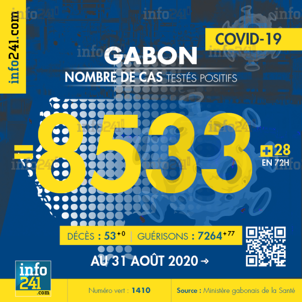 Ce qui porte le bilan à 8 533 cas confirmés, 53 décès et 7 264 guérisons. Le Gabon compte actuellement 1 216 cas actifs de la pandémie officiellement déclarés. Parmi eux 30(+0) patients hospitalisés dans le pays dont 2(+0) en réanimation.