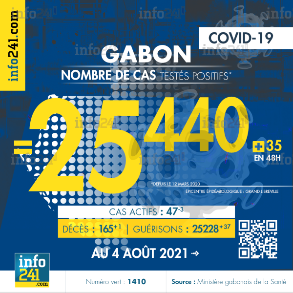 Ce qui porte le bilan à 25 440 cas confirmés, 165 décès et 25 228 guérisons. Le Gabon compte actuellement 50 (-4) cas actifs de la pandémie officiellement déclarés. Parmi eux 11 (-0) patients hospitalisés dans le pays dont 8 (+2) en réanimation.