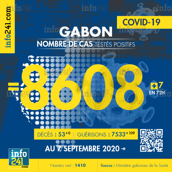 Ce qui porte le bilan à 8 608 cas confirmés, 53 décès et 7 533 guérisons. Le Gabon compte actuellement 1 022 cas actifs de la pandémie officiellement déclarés. Parmi eux 6(-3) patients hospitalisés dans le pays dont 2(+0) en réanimation.