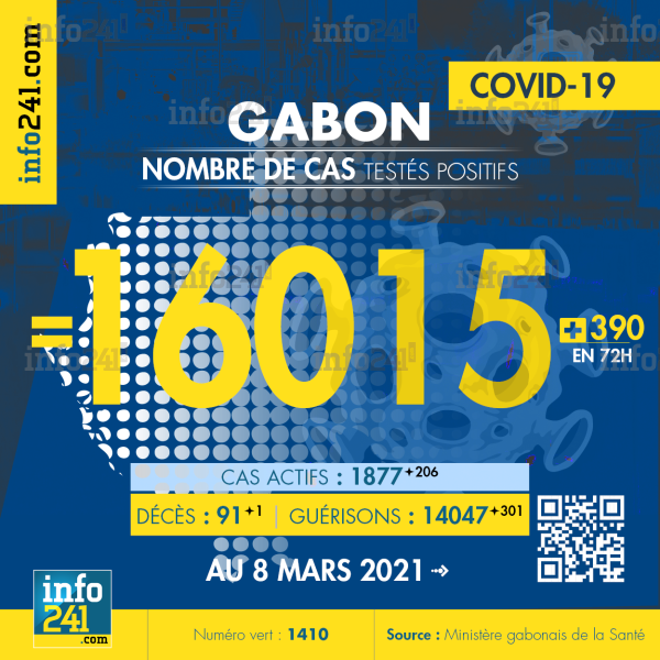 Ce qui porte le bilan à 16 015 cas confirmés, 91 décès et 14 047 guérisons. Le Gabon compte actuellement 1 877 (+206) cas actifs de la pandémie officiellement déclarés. Parmi eux 92(+20) patients hospitalisés dans le pays dont 23(+4) en réanimation.