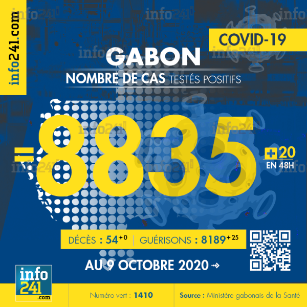 Ce qui porte le bilan à 8 835 cas confirmés, 54 décès et 8 189 guérisons. Le Gabon compte actuellement 592(-5) cas actifs de la pandémie officiellement déclarés. Parmi eux 2(-1) patients hospitalisés dans le pays dont 2(-1) en réanimation.