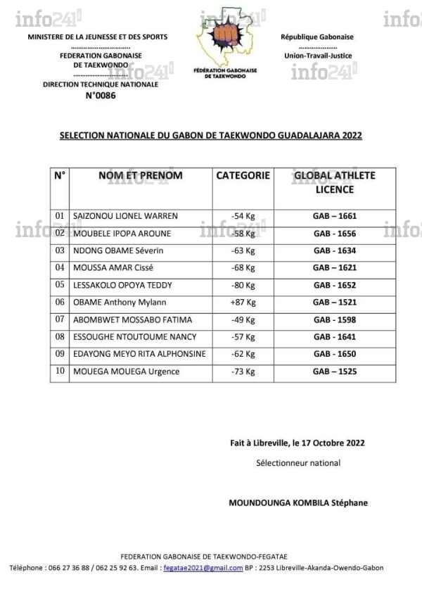 Coupe du monde de taekwondo 2022 : la liste des 10 représentants du Gabon © 2022 D.R./Info241