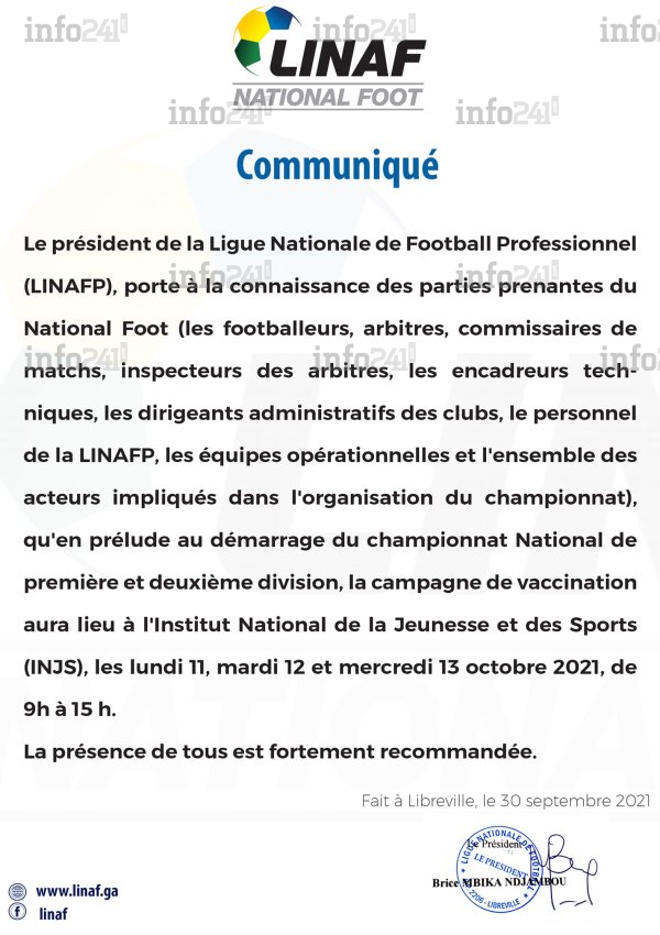 Ainsi, cette campagne de vaccination obligatoire « aura lieu à l’Institut National de la Jeunesse et des Sports (INJS), les lundi 11, mardi 12 et mercredi 13 octobre 2021, de 9h à 15 h », précise le communiqué signé des mains du président de la Linafp Brice Mbika Ndjambou. Et celui-ci de marteler à ces acteurs que leur présence était « fortement recommandée » au cours de cette opération sanitaire.