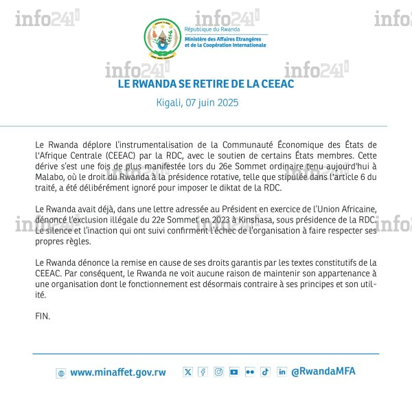 Dans un communiqué publié par son ministère des Affaires étrangères et de la Coopération internationale, le gouvernement rwandais fustige une « instrumentalisation » de la CEEAC par la RDC, qui aurait imposé son diktat en bloquant la présidence tournante censée revenir au Rwanda, conformément à l’article 6 du traité constitutif. Kigali rappelle également avoir été illégalement exclu du 22e sommet en 2023 à Kinshasa, sans qu’aucune sanction ou mesure corrective ne soit prise depuis.