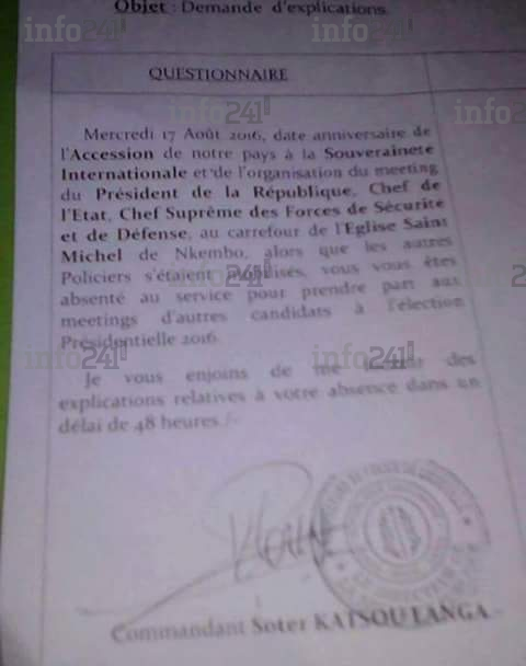 Dans ce document, le commandant Soter Katsou Langa réclame aux policiers des explications sur leur absence injustifiée aux meetings de celui qu’il nomme encore « le Chef suprême de sécurité et de défense ». Si Ali Bongo est toujours bien le président du Gabon jusqu’en septembre 2016, il n’en demeure pas moins que les activités politiques qu’ils mènent actuellement relèvent elles du candidat à la présidentielle et non du présidence de la république et de ses fonctions de chef de guerre.
