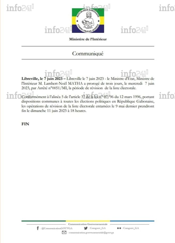 A en croire cet article, cette prorogation ne concerne que l’opération menée sur le plan national, pas celle menée en parallèle dans les représentations gabonaises à l’étranger. « La période de révision de la liste électorale est prorogée de trois (3) jours supplémentaires. La révision de la liste électorale prend fin le 11 juin 2023 à 18 heures », souligne le second article de cet arrêté. Celui-ci « sera enregistré, publié et communiqué partout où besoin sera », conclu la décision signée de Lambert Noel Matha.
