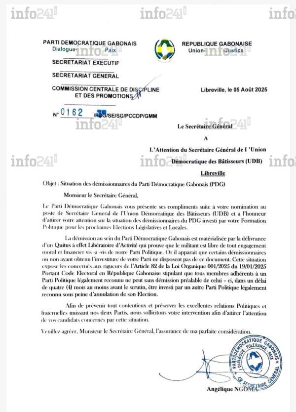 Décidément, l’Union démocratique des bâtisseurs (UDB) du président Oligui Nguema pourrait payer le lourd tribut pour avoir débauché plusieurs cadres de l’ancien parti présidentiel. Dans une lettre datée du 5 août, aux allures de mise en garde, la secrétaire générale du Parti démocratique gabonais (PDG, renversé le 30 août 2023), Angélique Ngoma, pique au vif son homologue de l’UDB, Mays Mouissi. En cause : des candidats alignés par l’UDB aux législatives et locales dont les démissions ne seraient pas en règle.