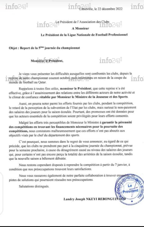 « Nous restons cependant disposés à reprendre la compétition à partir du 7 janvier 2023, à condition que nos préoccupations trouvent leurs satisfactions », a conclu Landry Nkeyi Rebonguinaud à son interlocuteur. La Linaf et le ministère des Sports ont ainsi encore quelques jours pour satisfaire à ces revendications financières pour une reprise saine du championnat gabonais de première division dans de meilleures conditions qui satisfassent toutes les parties le 7 janvier prochain.