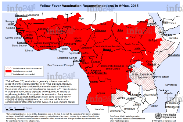 Carte des zones d’Afrique touchées par la fièvre jaune, selon l’OMS en 2015