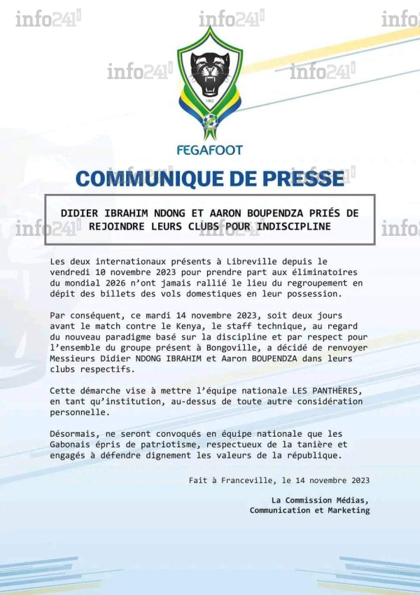 "Le staff technique, au regard du nouveau paradigme basé sur la discipline et par respect pour l’ensemble du groupe présent à Bongoville, a décidé de renvoyer messieurs Didier Ndong Ibrahim et Aaron Boupendza dans leurs clubs respectifs", précise la Fegafoot. Une situation qui n’étonne pas plus d’un, vu que le pensionnaire d’Al-Riyadh en Arabie Saoudite est un habitué des faits. Aaron Boupendza à l’inverse, n’est pas connu sur ce régistre.