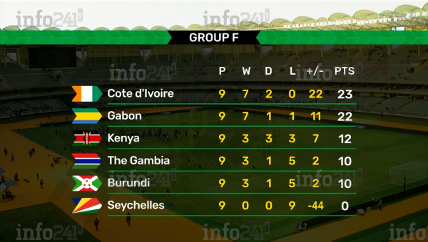 Réduits à dix, les Panthères serrent les rangs. Malgré cinq minutes de temps additionnel, les Gambiens ne parviennent pas à revenir. Le score en restera là, au terme d’un match haletant et plein de rebondissements. Grâce à ce succès, le Gabon conserve sa deuxième place du groupe F avec 22 points, juste derrière la Côte d’Ivoire, large vainqueur des Seychelles (7-0), qui compte désormais 23 points. Le Kenya suit à 18 points, tandis que la Gambie et le Burundi sont à égalité (10 points). Les Seychelles ferment la marche avec zéro point.