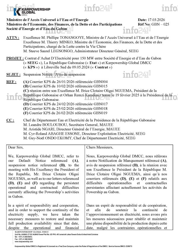 La mesure extrême a été formellement notifiée aux autorités gabonaise par le biais d’un avis de suspension officiel. Le document dont Info241 a eu copie, est adressé conjointement au ministre de l’Accès universel à l’eau et à l’énergie, Phillipe Tonangoye, à son collègue de l’économie, Thierry Minko, ainsi qu’au directeur général de la Société d’énergie et d’eau du Gabon (SEEG), Steeve Saurel Legnongo. Ce courrier sans équivoque dresse le constat d’une impasse financière totale entre l’État et son prestataire.