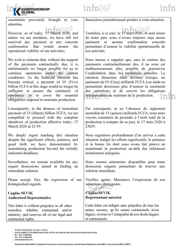 Bien que le fournisseur affirme avoir maintenu ses installations en état de marche au-delà des échéances initiales dans un esprit de responsabilité, le manque d’engagements financiers tangibles a précipité cette coupure. Dans son avis de suspension, la direction de l’entreprise assume sa position et justifie cette décision drastique : « Nous tenons à rappeler que, sans le soutien des paiements contractuellement dus, il ne nous est malheureusement plus possible de poursuivre l’exploitation dans les conditions actuelles ».