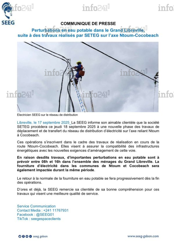Les désagréments attendus sont importants. « En raison desdits travaux, d’importantes perturbations en eau potable sont à prévoir entre 08h et 16h dans l’ensemble des ménages du Grand Libreville », a indiqué la SEEG. La société publique d’énergie précise en outre que l’alimentation en électricité des communes de Ntoum et Cocobeach sera également impactée au cours de la même période.