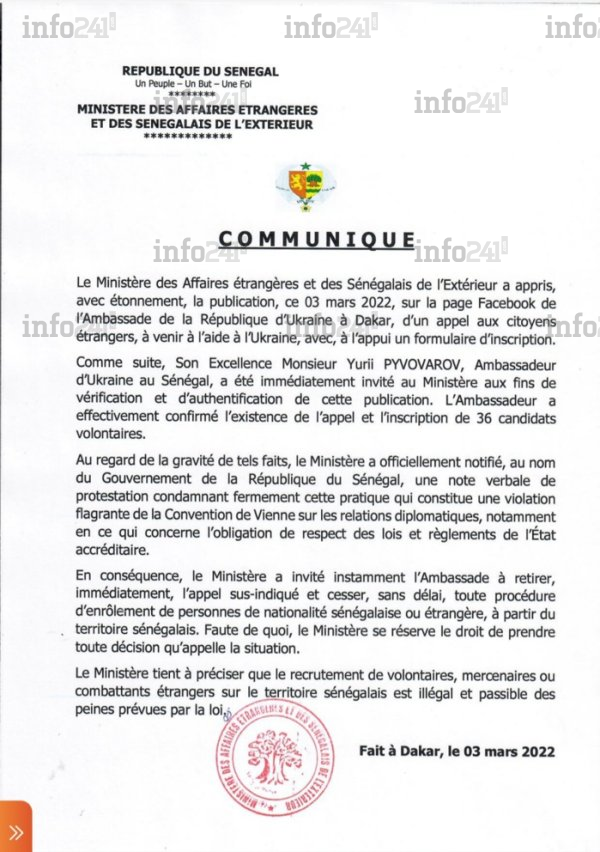 Le ministère sénégalais des Affaires étrangères et des sénégalais de l’extérieur (Maese) a adressé jeudi à l’ambassadeur d’Ukraine à Dakar une note de protestation verbale après que l’ambassade ukrainienne dans la capitale sénégalaise ait initié un processus d’enrôlement de volontaires pour aider l’Ukraine contre l’offensive militaire russe.