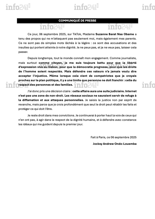 Les tensions sont vives au sein de la diaspora gabonaise en France. Visé, ainsi que sa famille, par des propos de Suzanne Barat Nsa Obame tenus sur internet, le journaliste Jocksy Andrew Ondo-Louemba a annoncé qu’il allait porter plainte. Ce samedi 6 septembre, Dans une vidéo largement partagée, Suzanne Barat Nsa Obame a pris pour cible Jocksy Andrew Ondo-Louemba et ses parents. Pour l’intéressé, ces déclarations ne relèvent pas d’un simple désaccord mais constituent une attaque directe contre son honneur et celui de sa famille.