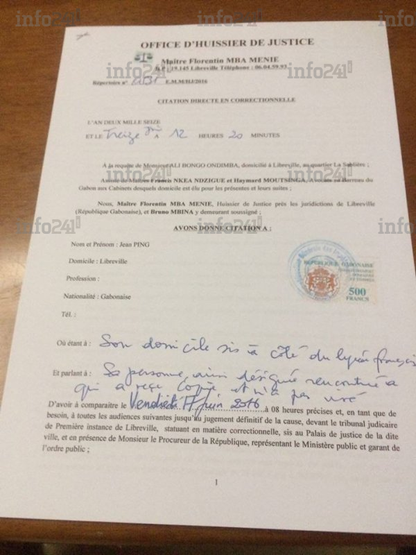 Hier, Info241 faisait déjà état de l’ouverture du procès vendredi 17 juin, où le candidat résolument engagé à en découdre avec le régime Bongo-PDG, Jean Ping est convoqué à comparaître en correctionnel pour les chefs d’accusation de diffamation et injures publiques. Le ministère public gabonais reproche entre autre, au natif d’Omboue, d’avoir appelé à travers les propos incriminés, au trouble à l’ordre public, incitation à la révolte, à la haine et à la désunion des citoyens.