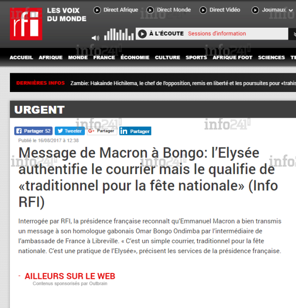 « C’est un simple courrier, traditionnel pour la fête nationale. C’est une pratique de l’Elysée », ont précisé à RFI les services de la présidence française. La "reconnaissance" tant rêvé par du régime controversé de Libreville dont la réélection a été profondément remise en cause par l’Union européenne, devra encore attendre. Un cinglant revers donc pour Ali Bongo et ses médias propagandistes qui avaient tenté de surexploiter ledit message conventionnel de l’Etat français au peuple gabonais pour ses 57 ans d’indépendance.