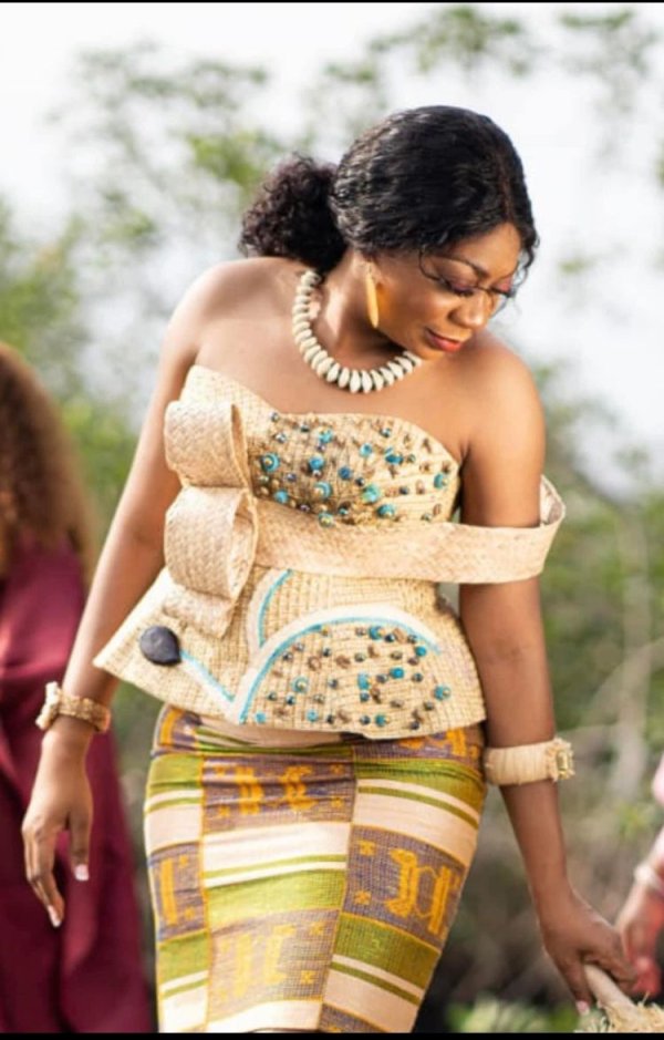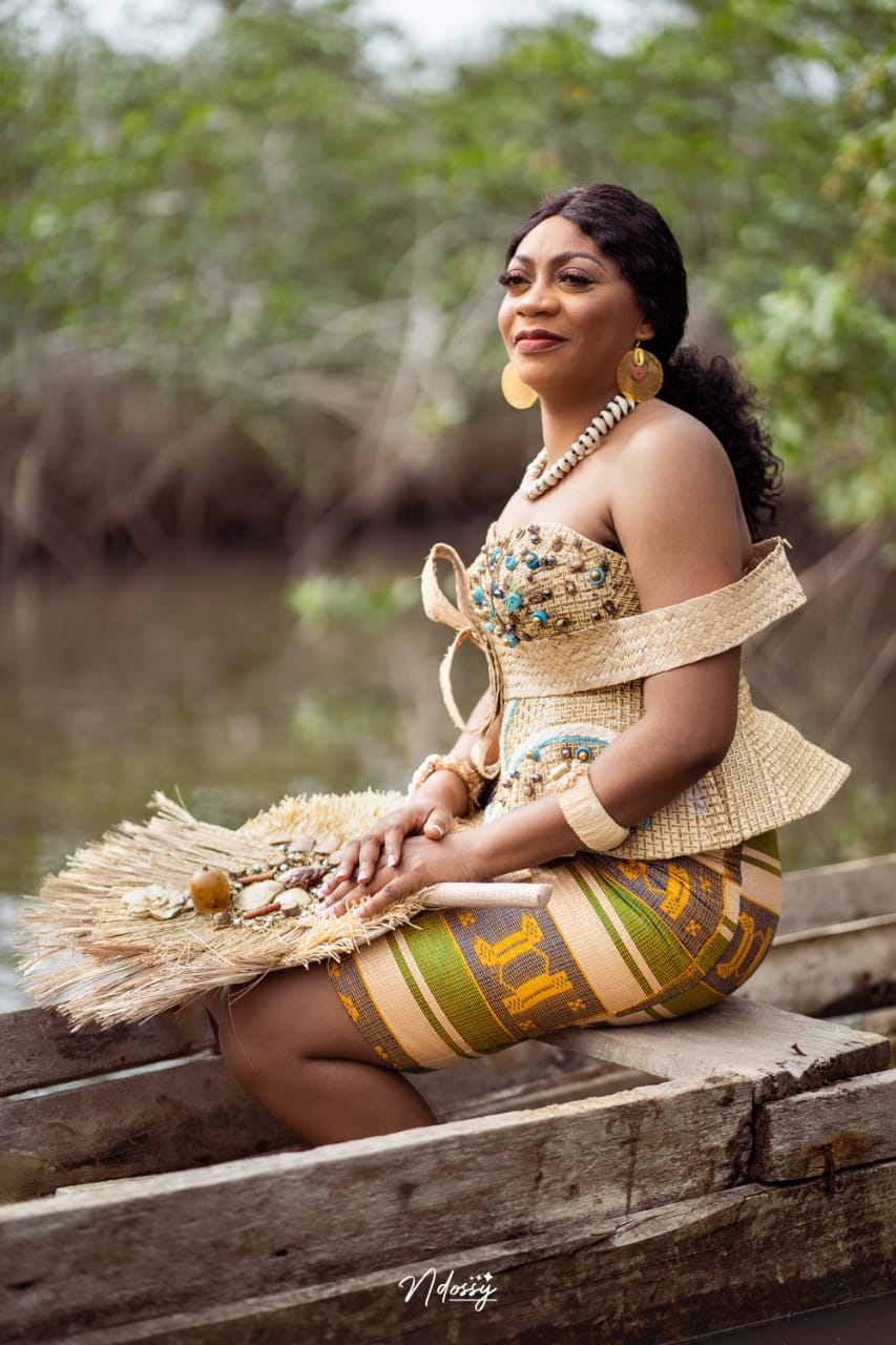 La diva, telle une reine africaine dans sa splendeur artistique vêtue de raphia et des cories made in Gabon
