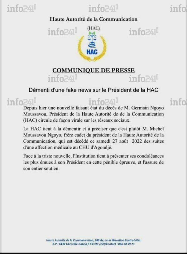 « La HAC tient à la démentir et à préciser que c’est plutôt M. Michel Moussavou Ngoyo, frère cadet du président de la Haute Autorité de la Communication, qui est décédé ce samedi 27 août 2022 des suites d’une affection médicale au CHU d’Agondjé », a souligné le régulateur des médias au Gabon. Si la rumeur concernait le président de la HAC, le malheur a bien frappé les siens puisqu’il s’agit du frère de ce dernier.