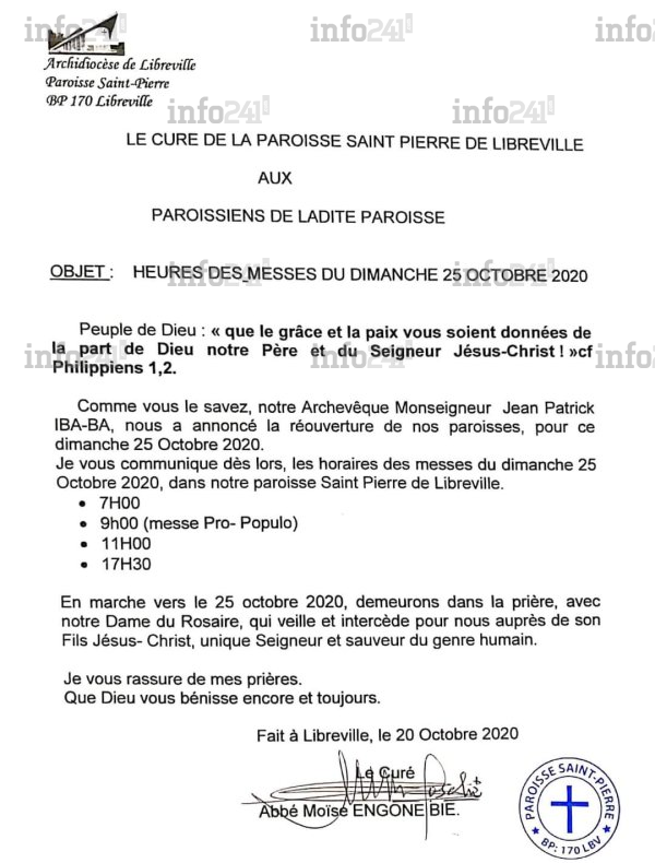 A l’instar de plusieurs paroisses du Gabon et à l’appel de l’archevêque de Libreville, la célèbre paroisse St Pierre de Libreville prévoit d’accueillir du monde ce dimanche. Selon un communiqué parvenu ce mardi à la rédaction d’Info241, quatre messes attendront les chrétiens de la capitale ce 25 octobre dans cette paroisse. Un exemple de la fronde désormais ouverte entre l’Eglise et le gouvernement gabonais qui a préféré décaler de 5 jours la réouverture des lieux de culte dans le pays en raison de la pandémie de coronavirus.
