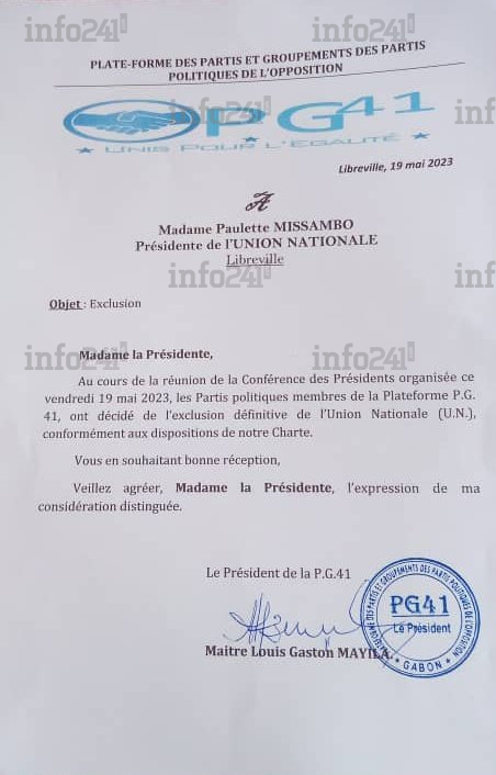 Dans son courrier de divorce, le président de la plateforme modérée informe brièvement la présidente de l’UN de la teneur de la décision prise ce vendredi au cours d’une réunion les partis membres de ce regroupement de l’opposition. « Au cours de la réunion de la Conférence des présidents organisée ce vendredi 19 mai 2023, les partis politiques membres de la plateforme PG41, ont décidé de l’exclusion définitive de l’Union nationale (UN) », précise laconiquement le courrier.