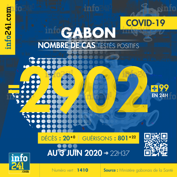 Le bilan de l’épidémie de coronavirus au Gabon au 3 juin : 99 nouveaux cas enregistrés en 24h dans l’Estuaire (84 cas) et le Moyen-Ogooué (15 cas). Il n’y a eu aucun nouveau décès et 22 nouvelles guérisons. Ce qui porte le bilan à 2 902 cas confirmés, 20 décès et 801 guérisons.. Il y a actuellement 99(+3) patients hospitalisés dans le pays dont 15 (+3) en réanimation.