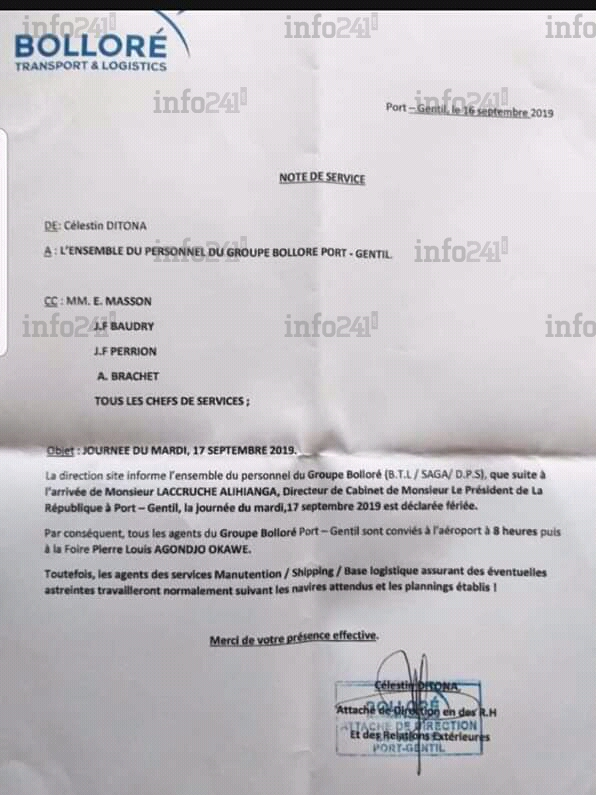 C’est via un courrier daté de ce lundi que les agents du groupe Bolloré de Port-Gentil ont été saisis par leur hiérarchie pour les inviter à s’inviter sur le terrain politique du PDG, en se rendant massivement à l’aéroport de la capitale économique gabonaise. Dans ce courrier qui a fuité sur la toile, Celestin Ditona attaché de direction, est formel : « la direction site informe à l’ensemble du personnel du Groupe Bolloré (BTI/SAGA/DPS) que suite à l’arrivée de monsieur Brice Laccruche Alihanga (...) la journée du mardi 17 septembre 2019 est déclarée fériée ».