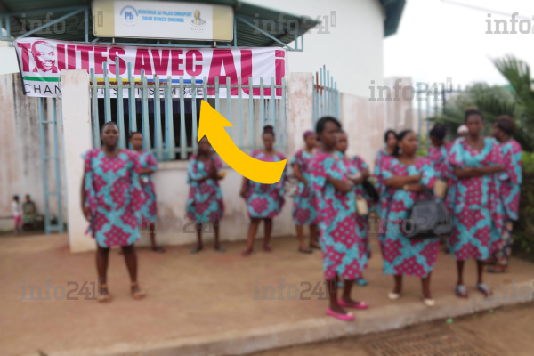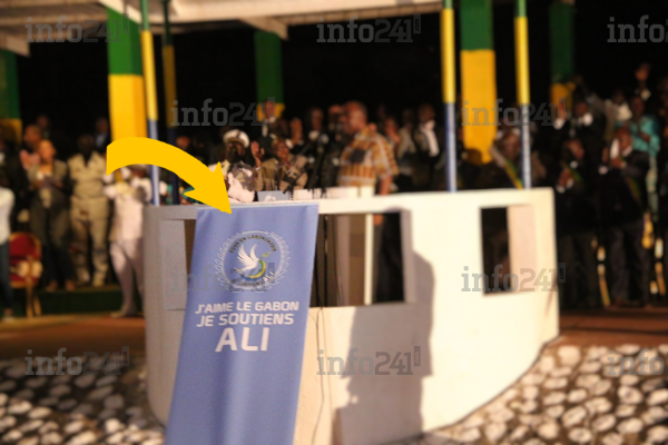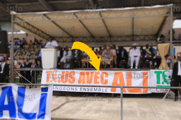 A Tchibanga, le podium où s’est exprimé Ali Bongo avait la même banderole qu’à son meeting de Libreville