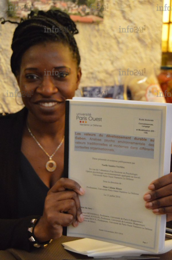 La jeune chercheuse gabonaise Naelle Sandra Nanda a soutenu récemment sa thèse avec la mention très honorable en psychologie, option psychologie environnementale appliquée au travail, intitulée : « Les valeurs du développement durable au Gabon. Analyse psycho environnementale des valeurs traditionnelles et modernes dans différents contextes organisationnels », sous la direction du professeur Liliane Rioux, à l’Université Paris Ouest Nanterre La Défense, au sein de l’école doctorale ’’ Connaissances, Langage et Modélisation (ED139)’’.