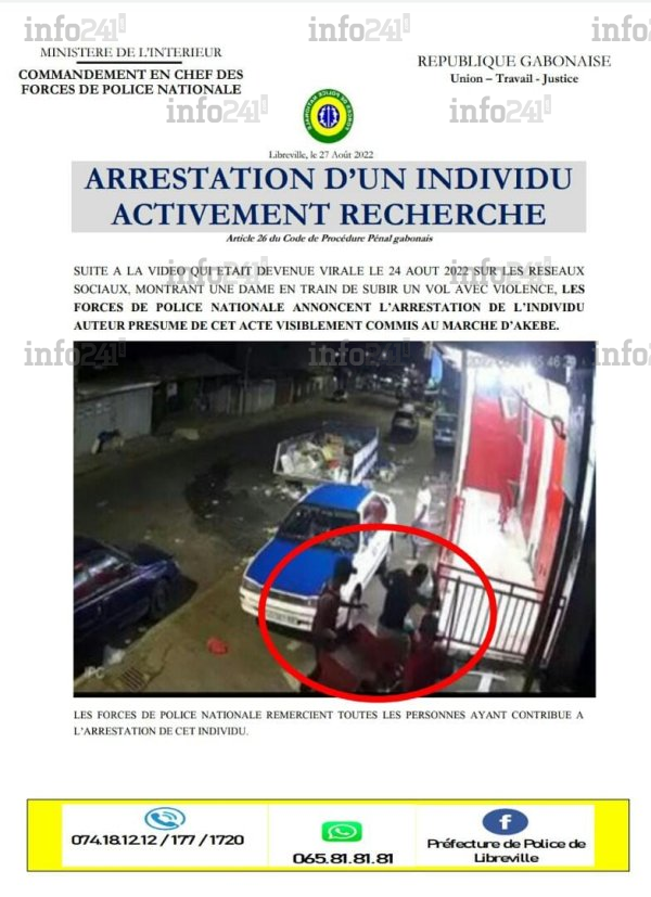 Le bandit a pu être identifié grâce à un avis de recherche aussitôt contre le malfrat. Activement recherché depuis le 24 août dernier grâce à cette vidéo qui a créé l’indignation sur les réseaux sociaux, l’individu en cavale a heureusement été arrêté. C’est du moins ce que précise l’avis d’arrestation publié par la police nationale. « Les forces de police nationale informe l’arrestation de l’individu auteur présumé de cet acte visiblement commis au marché d’Akébé », a indiqué ce 27 août dernier le commandement en chef des forces de police.