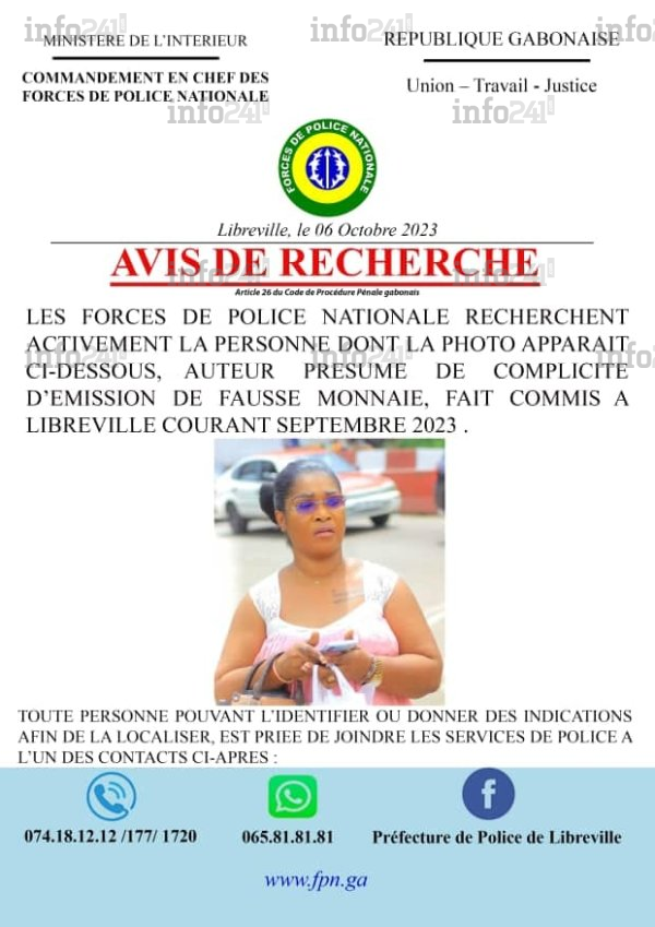 Fort de ce qui précède, le commandement en chef des forces de police nationale vient de lancer un avis de recherche afin de mettre la main sur une dame, présumée complicité d’émission de fausse monnaie. « Les forces de police nationale recherchent activement la personne dont la photo apparaît ci-dessous, auteur présumé de complicité d’émission de fausse monnaie. Des faits commis à Libreville courant septembre 2023 », précise l’avis de recherche parvenu à la rédaction d’Info241.