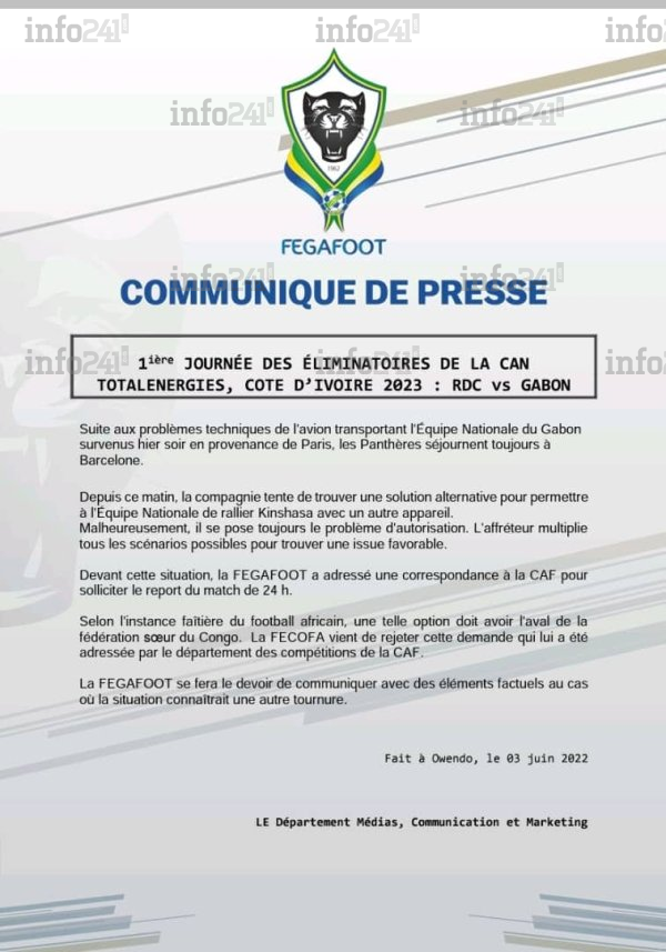 C’est la Fédération gabonaise de football (FEGAFOOT) qui a annoncé ce vendredi via un communiqué à la presse, la fin de non recevoir de la Fédération congolaise de football association (FECOFA). « La FECOFA vient de rejeter cette demande qui lui a été adressée par le département des compétitions de la CAF », souligne le communiqué du département médias de la FEGAFOOT parvenu à la rédaction d’Info241.