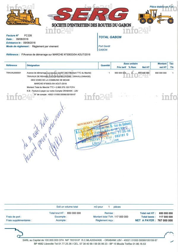Le 9 août 2016, par courrier n°006235 MPH/CM, le ministre Etienne Dieudonné Ngoubou transmet au directeur général de Total Gabon la facture n°FC226 de la Société d’Entretien des routes du Gabon (SERG) basée à Mouila ainsi qu’une copie du contrat référencé n°0063/04/Août/2016, signé par entente directe (gré à gré) entre le ministère du Pétrole et des Hydrocarbures et ladite société pour la réalisation des travaux de réhabilitation des voiries de la commune de Moabi dans la Nyanga pour un montant de près de 3 milliards de francs CFA (précisément 2 865 375 120 FCFA), pour paiement, sous huitaine, sur le Fonds de développement de communautés locales.