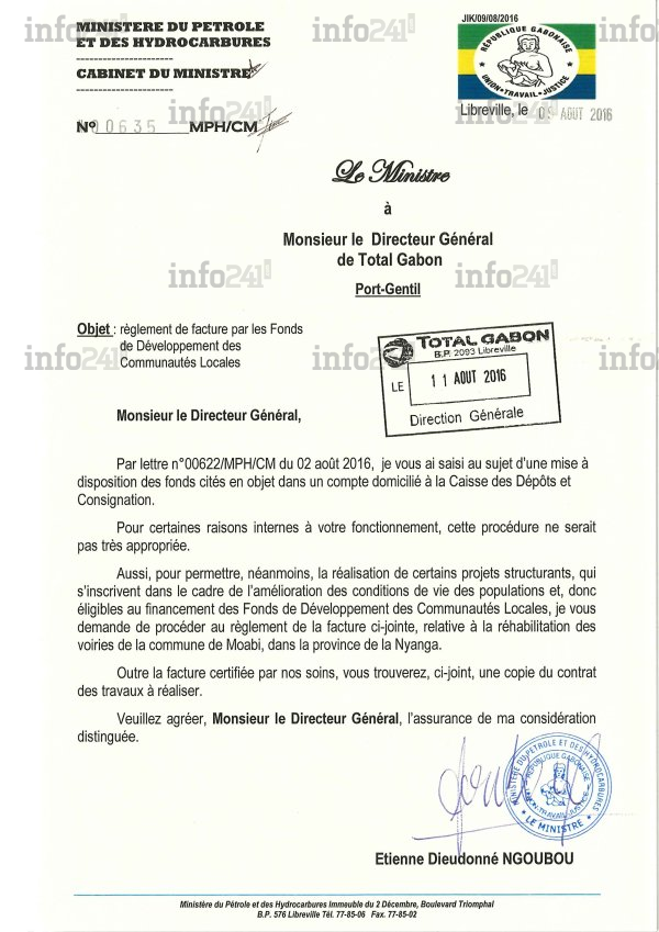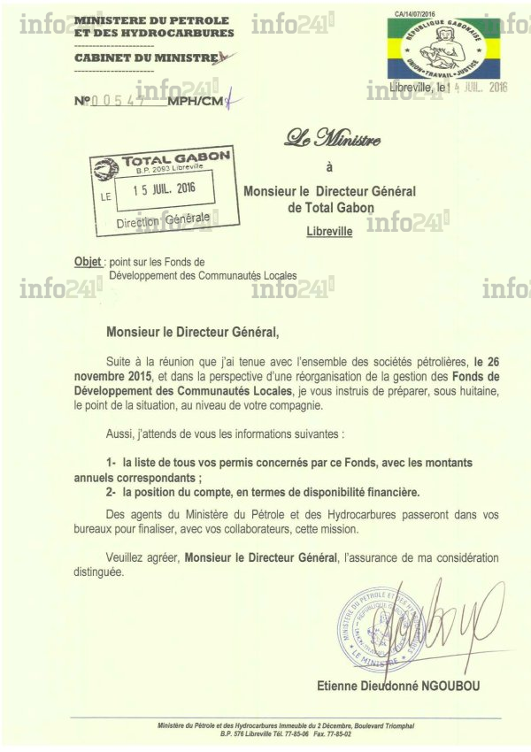 Une semaine plus tard soit le 21 juillet 2016, par courrier référencé n°2016-0042, Total Gabon transmet au ministre ces informations. Le 2 août 2016, par courrier n° 0062 MPH/CM, le ministre Etienne Dieudonné Ngoubou demande au directeur général de Total Gabon la mise à disposition du solde des fonds de développement des communautés dans un compte à la Caisse de dépôts et consignation (CDC).