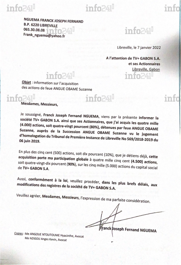 La lettre de Franck Nguema annonçant détenir 90% de TV+