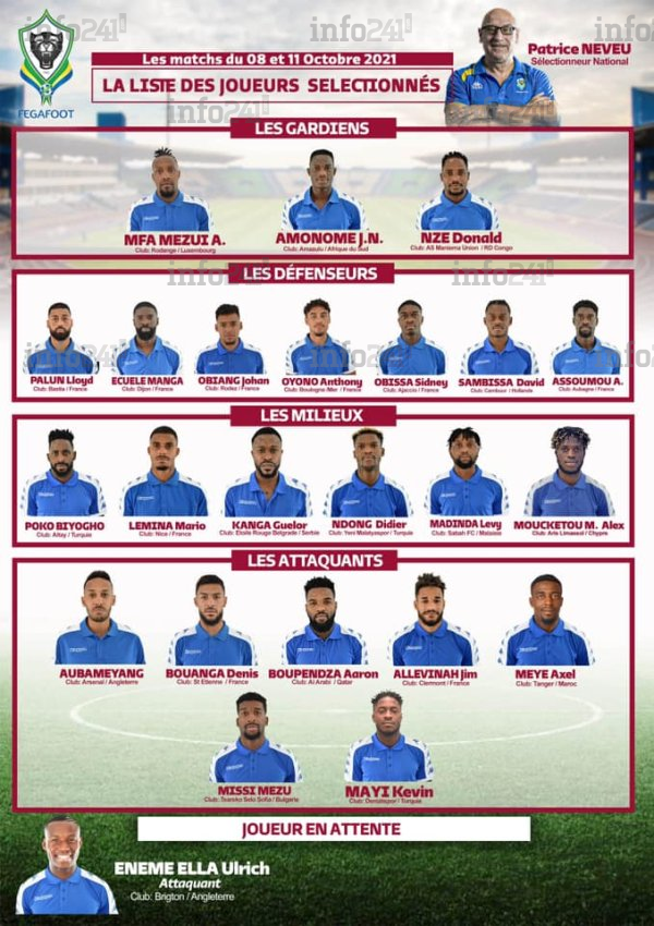 En milieu de terrain, Patrice Neveu a misé sur 6 hommes : André Poko Biyogho, Mario Lemina, Guelor Kanga, Ibrahim Didier Ndong, Levy Madinda et Alex Moucketou Moussounda. Comme attaquants, outre le trio Aubameyang-Bouanga-Boupendza, il faudra compter sur le renfort constitué de Jim Allevinah, Axel Meye, Gaëtan Missi Mezu et Kevin Mayi. On notera l’absence de Fahd-Richard Ndzengue Moubeti blessé et Gilchrist Nguema exclu de cette liste.
